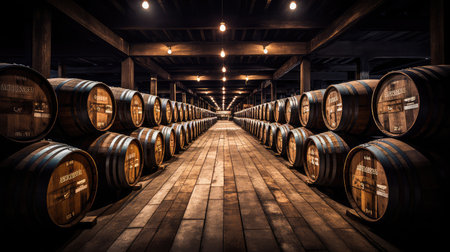 Whiskey, bourbon, scotch or wine barrels in an aging facility. Wooden wine barrels in perspective. Wine vaults. Vintage oak barrels of craft beer or brandy.