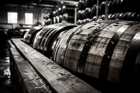Vintage whiskey barrel aging in a distillery pictured in black and white