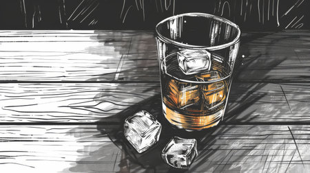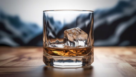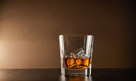 A glass of amber whiskey with ice cubes on a wooden table. Dark wood background. Classic drink scene with a luxurious and sophisticated ambiance, perfect for upscale settings or elegant events.