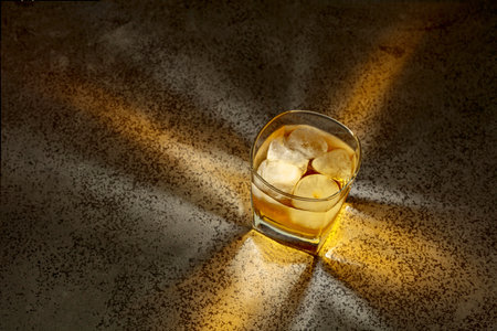 Whiskey in a crystal glass with ice on an old stone table. Hard light with beautiful shadow. Copy space.