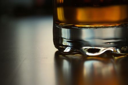 Glass of whiskey on a cold and wet surface of a bar counter.
