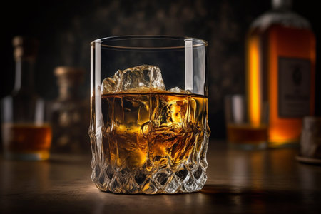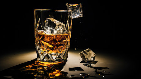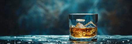 Whiskey glass with ice on dark blurred background, providing ample copy space for text placement