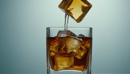 A dramatic shot of a single ice cube splashing into a glass of whiskey, capturing the moment of impact and the richness of the drink, with a soft white background for focus.