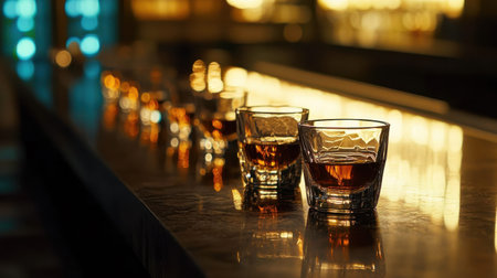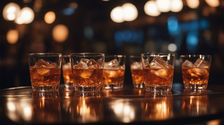 A Rich whiskey glasses lined up on dark wood bar