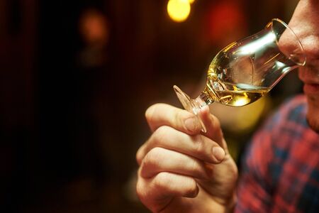 Scotch single malt or blended whisky tasting on distillery in Scotland, UK, close up