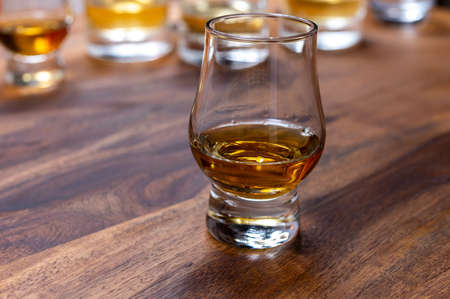 Tasting of flight of Scotch whisky from special tulip-shaped glasses on distillery in Scotland, UK close up