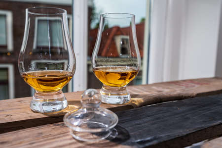 Dram of single malt scotch whiskey served in tasting glass with view on old window and houses on used wooden box