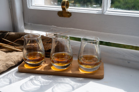 tasting bottles and glasses of whisky spirit brandy cognac. tasting at home