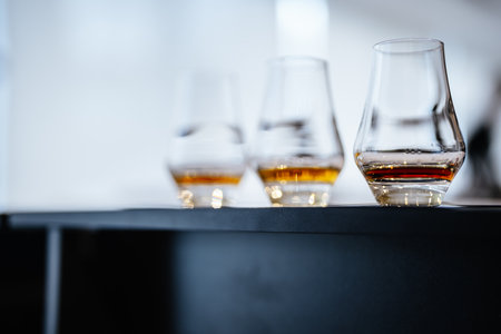 Glasses of whiskey elegantly displayed at a tasting event in evening light