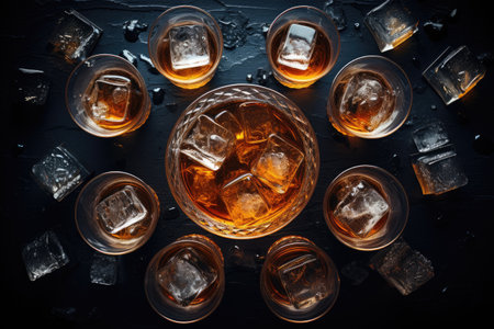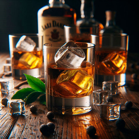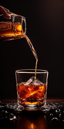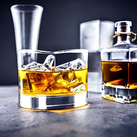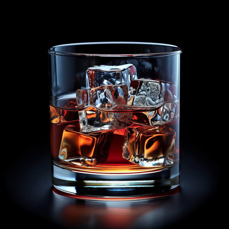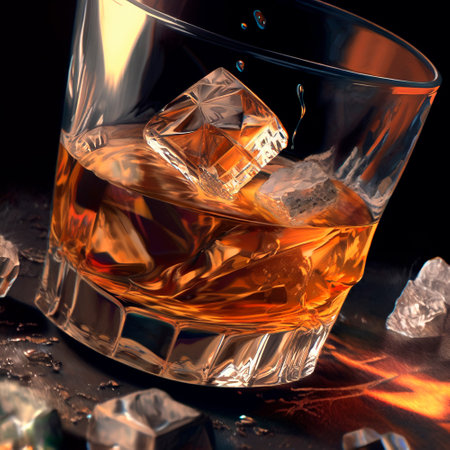 Elegant whiskey glass with ice cubes against a chic black background for a sophisticated look