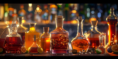 Different bitters and liqueurs on table in bar background - Ai Generated