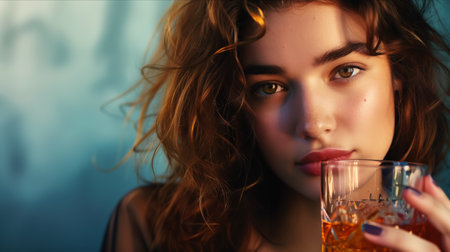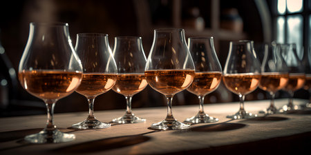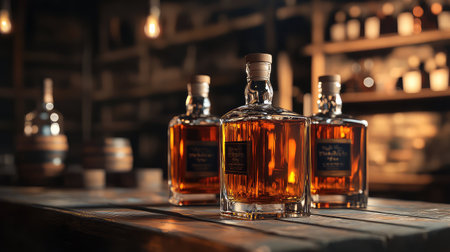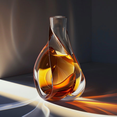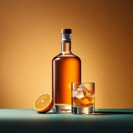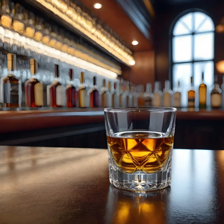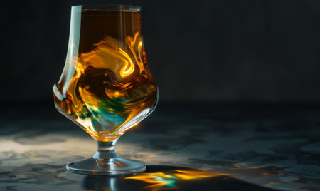 Elegant whiskey glass with swirling amber liquid, illuminated by moody lighting for a dramatic effect