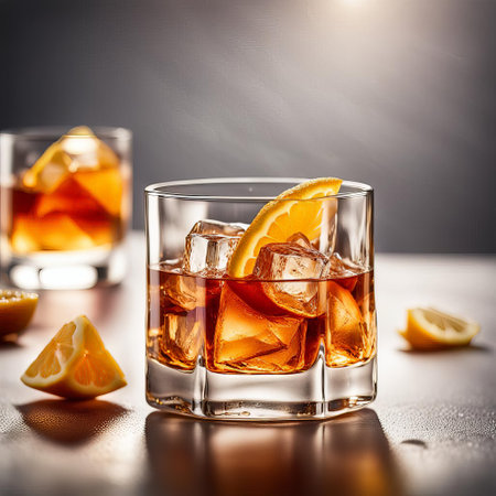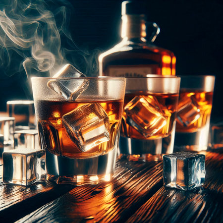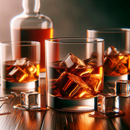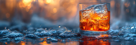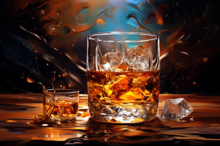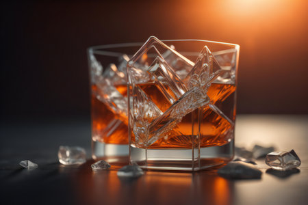 Artistic depiction of whiskey glasses with ice cubes, capturing a dynamic splash against a warm backdrop
