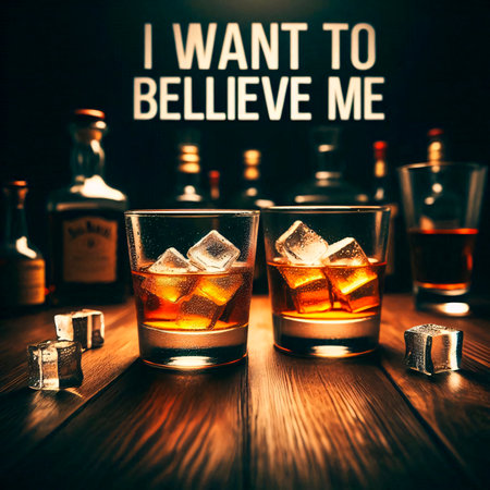 I want to believe me message with glass of whiskey and ice cubes on wooden background