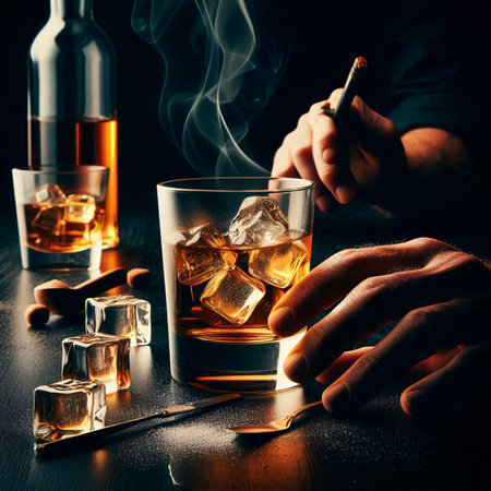 Man with cigar and glass of whiskey with ice cubes on dark background