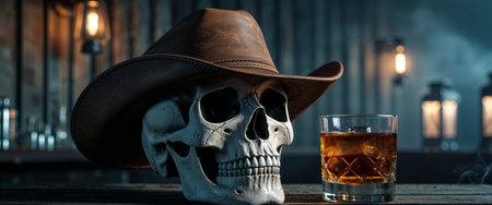 AI Generated. Skull with cowboy hat beside a glass of whiskey in a rustic bar setting at night