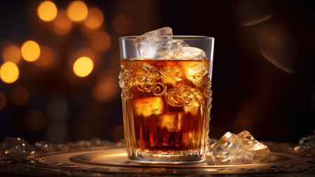 A close-up of a sparkling glass filled with ice cubes and a refreshing beverage, illuminated by bright bokeh highlights, creating a cozy atmosphere perfect for any occasion.