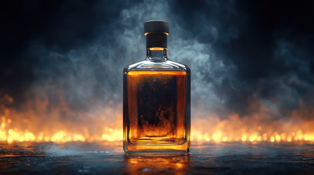 A glass bottle filled with dark amber liquid stands out against a moody backdrop of swirling smoke and warm light. The environment creates an artistic and dramatic atmosphere, highlighting the bottle's texture and color.