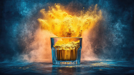 A glass filled with amber liquid reflects light, surrounded by dynamic, golden waves on a deep black backdrop, creating an illusion of motion and energy around the drink