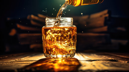 Liquid gold pouring into crystal whiskey glass generated by artificial intelligence
