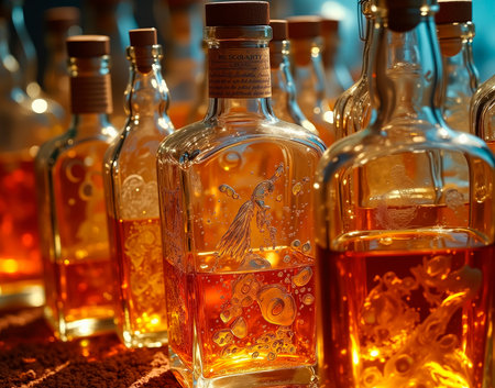 Broken whiskey bottles with holographic reflections and amber gradients, representing addiction and its impact.