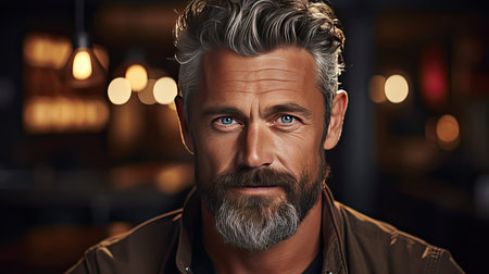 Portrait of happy mature man looking at camera outdoor. Senior businessman with beard feeling confident at sunset. Model portrait illustration. Generative AI art