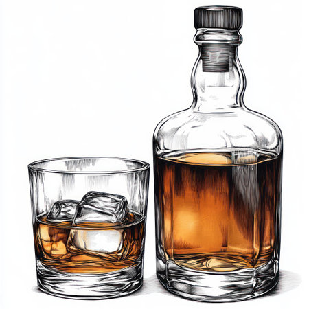 Fresh whiskey on clear glass and bottle also diced ice alcohol drawing. picture & image beverage in a bar illustration for background