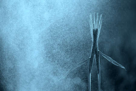 Beautiful dew drops on a dandelion seed macro. Beautiful soft blue background. Water drops on a parachutes dandelion. Copy space. soft focus on water droplets. circular shape, abstract background.
