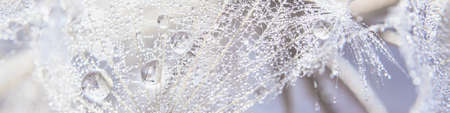 Beautiful dew drops on dandelion seed macro. soft background. Water drops on parachutes dandelion. Copy space. soft focus on water droplets. circular shape,