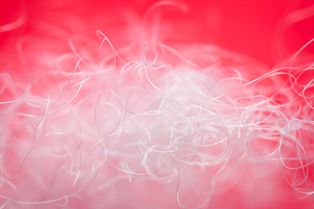 Extreme macro of polyester stable fiber on red background. Selective focus, shallow depth of field. Abstract dreamy background