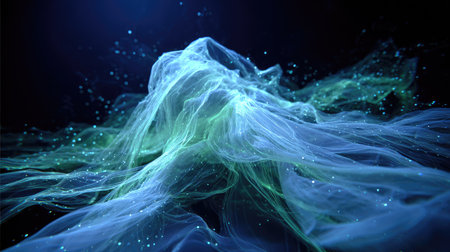 An abstract illustration presents flowing energy forms in blue and green hues, creating a dynamic visual. The artwork features a fluid, cloud-like texture set against a dark background. This image could be suitable for digital art projects, website backgrounds, or conceptual design elements.