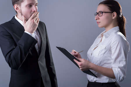 Portrait of young business people in business suits. The subordinate guy yawns during a serious message from the head of a business woman with documentation