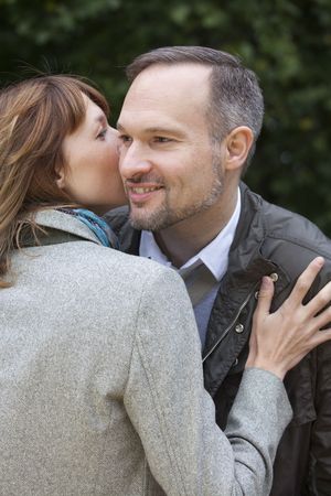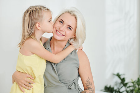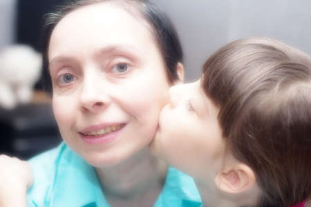 The daughter loves the mother. Daughter gently kisses her mother on the cheek.