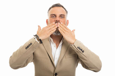 Portrait of man wearing smart casual covering mouth like mute concept isolated on white background