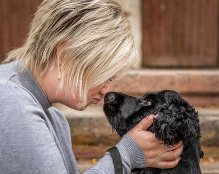 Pet care concept. Young blond woman enjoying time with her cocker spaniel dog outdoors
