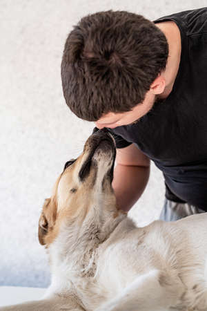 young woman loves her puppy and gives a kiss (focus on kissing mouth)