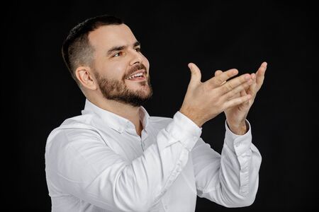 portrait of bearded man in white shirt telling something isolated on black background. man explains to someone