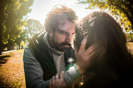 Bully and abuser, a jealous boyfriend abuses his girl girlfriend, verbally and physically threatens, yells at her and scares her, outdoor in public park. Domestic violence concept