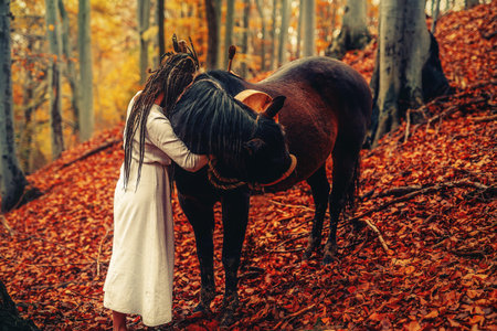 A young girl found peace and relief from stress in connection with an animal. Love and devotion between people and animals. Woman looking into the eyes of a horse