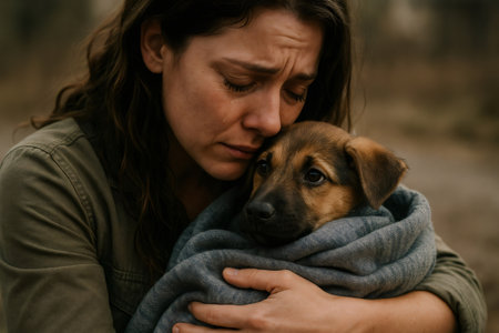 Veterinarian comforting a rescued puppy, wrapped in a blanket, showing compassion and care for animals