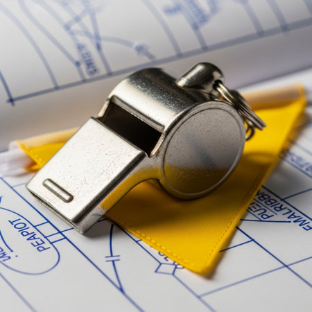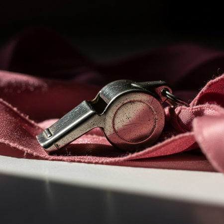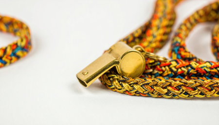 Macro whistle on woven lanyard detail widescreen with clean copy space above sports accessory coaching tool design advertising background