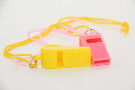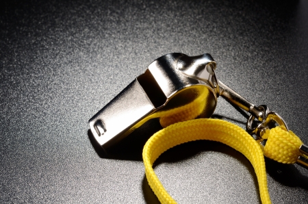 Sports whistle on yellow background. Concept- sport competition, referee, statistics, challenge. Basketball, handball, futsal, volleyball, soccer, baseball, football and hockey referee whistle