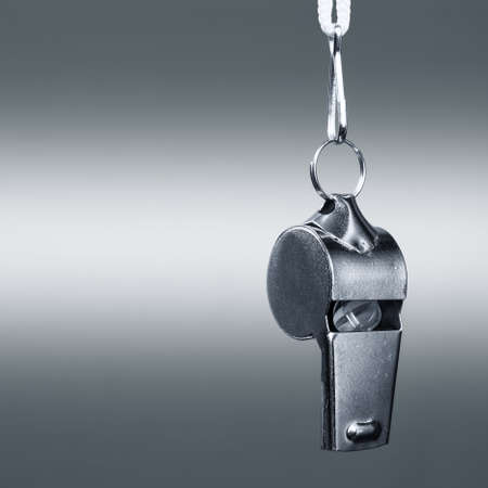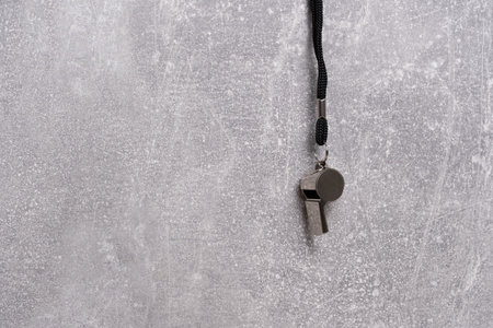 Sports whistle on grey background. Concept - sport competition, referee, statistics, challenge. Basketball, handball, futsal, volleyball, soccer, baseball, football and hockey referee whistle