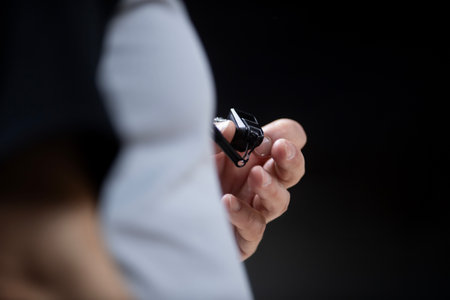 Miniature people toy figure photography. Whistle blower concepts. A shrugging businessman standing in front of black whistle. Isolated on white background. Image photo