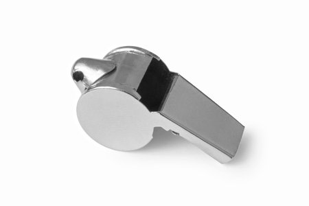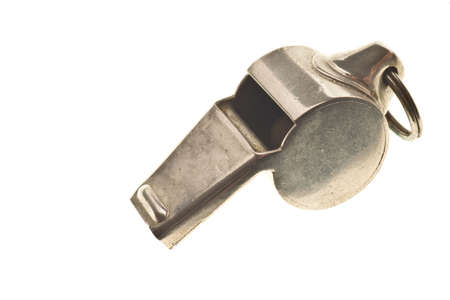 A simple metal whistle isolated on a white background. Whistle close-up.