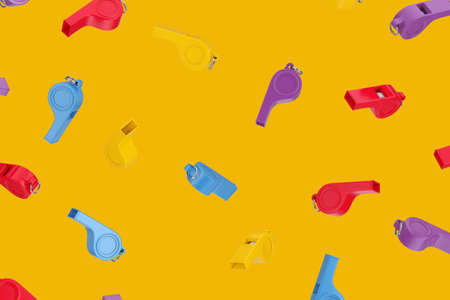 Many Multicolor Whistles on a yellow background. 3d Rendering