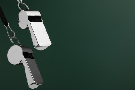Referee equipment. Metal whistles on dark green background, closeup and space for text