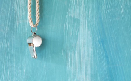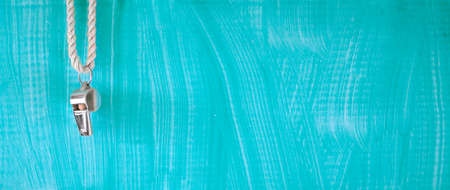 Whistle of soccer referee or trainer on blue grungy background. Great soccer event this year, large free copy space