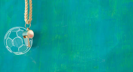 whistle of a soccer / football referee on green paint background, soccer mock up with free copy space