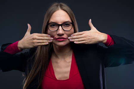 Closeup view of businesswoman shushing a quiet gesture on dark background